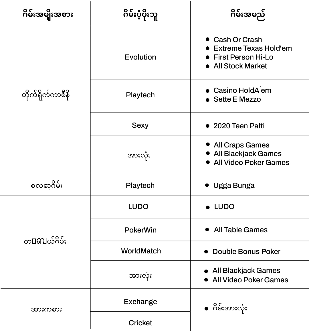 ကျွန်ုပ်တို့၏ပလပ်ဖောင်းပေါ်တွင်တင်ထားသော အလောင်းအစားအများစုကို အလှည့်အပြောင်းတွက်ချက်မှုအဖြစ် ထည့်သွင်းရေတွက်နိုင်သော်လည်း၊ ကျွန်ုပ်တို့ကမ်းလှမ်းထားသော ဘောနပ်စ်များကို ဂိမ်းများစွာတွင်အသုံးပြုနိုင်သော်လည်း ခြွင်းချက်အချို့ရှိပါသည်။ ဘောနပ်စ်လောင်းကြေးနှင့် လှည့်ပတ်တွက်ချက်မှုများမှ ဖယ်ထုတ်ထားသော ဂိမ်းများနှင့် အားကစားစျေးကွက်အသေးစိတ်အချက်အလက်များအတွက် အောက်ပါဇယားကို ဖတ်ရှုပါ-
